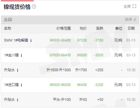 SMM鎳金屬現(xiàn)貨價格